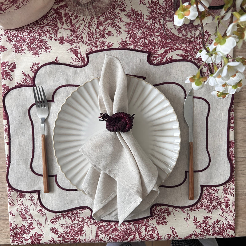 Set 4 Individuales Toile de Jouy granate + Camino de mesa Hueso + 4 servilletas granate