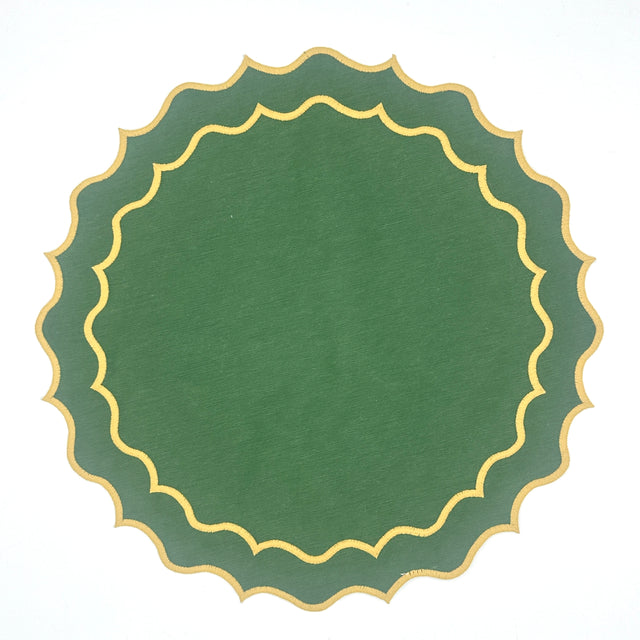 Delicado individual de forma redonda en tela antimanchas color verde olivo, con un fino bordado doble en hilo de algodón mate color ocre, formando un elegante diseño con ondas.