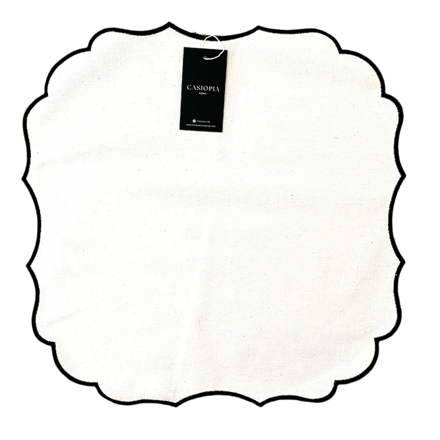 Delicada servilleta de forma cuadrada en tela de algodón color hueso, con un fino bordado en hilo de algodón negro mate, formando un elegante diseño con ondas.