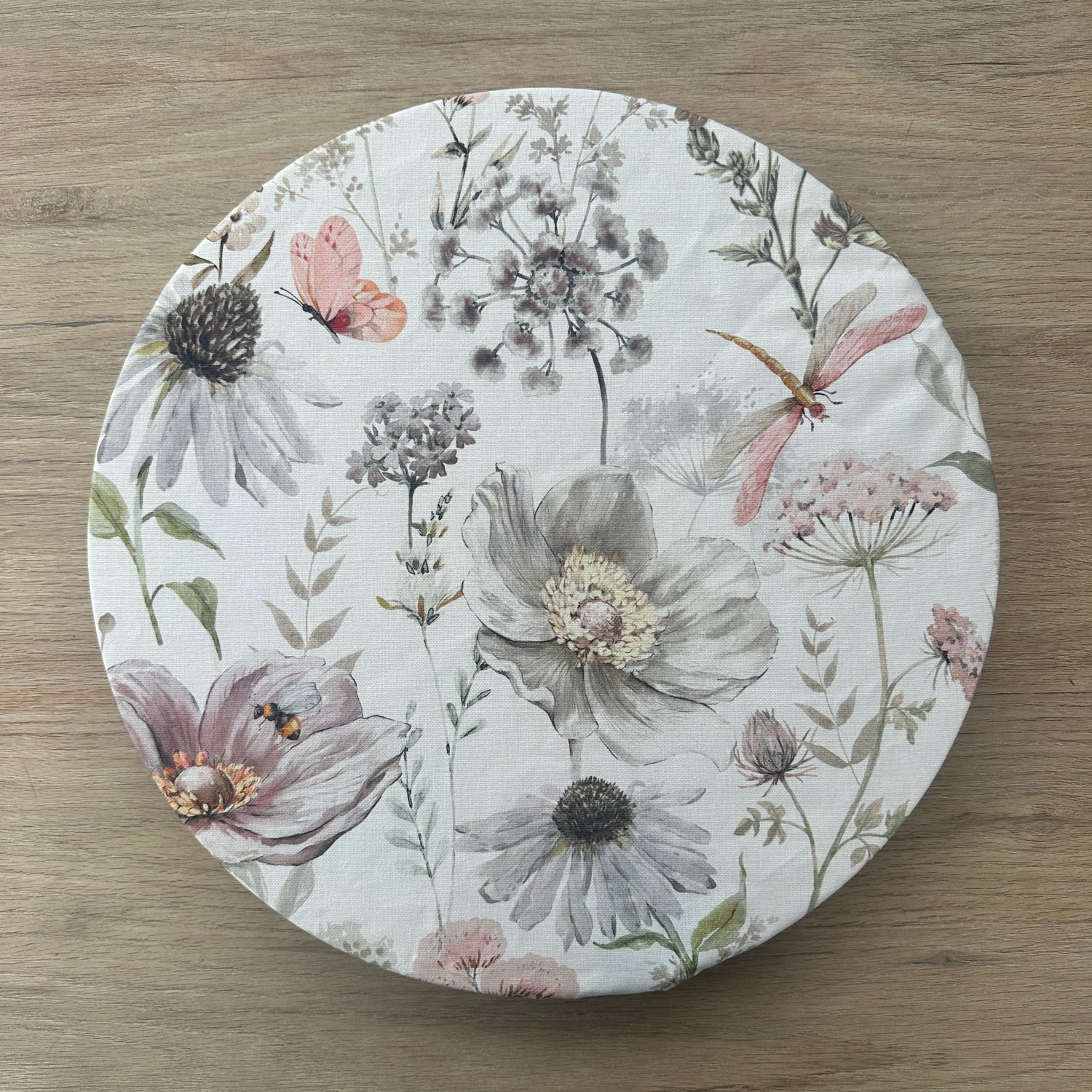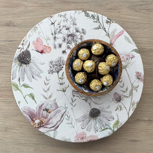 Práctica tabla giratoria confecionada en madera de pino, para colocar en el centro de la mesa. Funda antimanchas ajustable y removible diseño Natura, de fondo crema y flores en tonos empolvados. Puedes cambiar el diseño con cada mantel u ocasión.