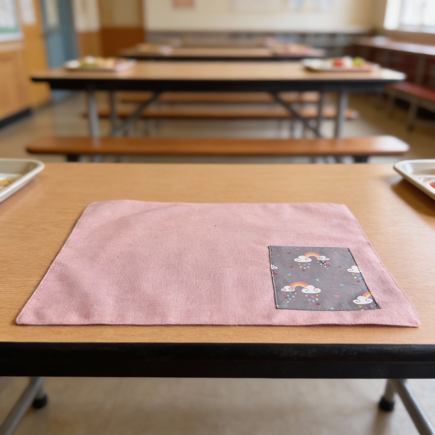 Preciosos y prácticos individuales de lonchera reversibles con nuestra tela antimanchas color rosa por un lado, y por el otro un divertido estampado de arcoiris sobre fondo gris, ideal para los más peques de la casa. El lado color entero lleva incorporado un pequeño bolsillo en el estampado de los arcoiris, perfecto para meter los cubiertos o la servilleta.