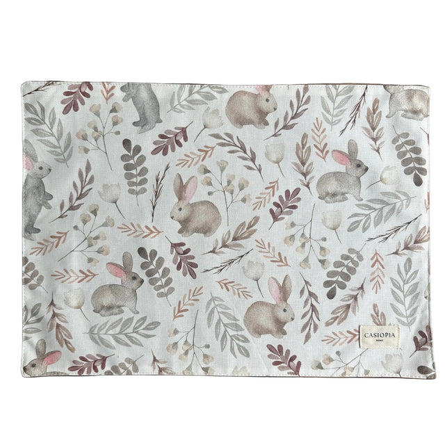Preciosos y prácticos individuales de lonchera reversibles con nuestra tela antimanchas color beige por un lado, y por el otro un divertido estampado de conejitos y hojitas sobre fondo color hueso, ideal para los más peques de la casa. El lado color entero lleva incorporado un pequeño bolsillo en el estampado de los conejitos, perfecto para meter los cubiertos o la servilleta.