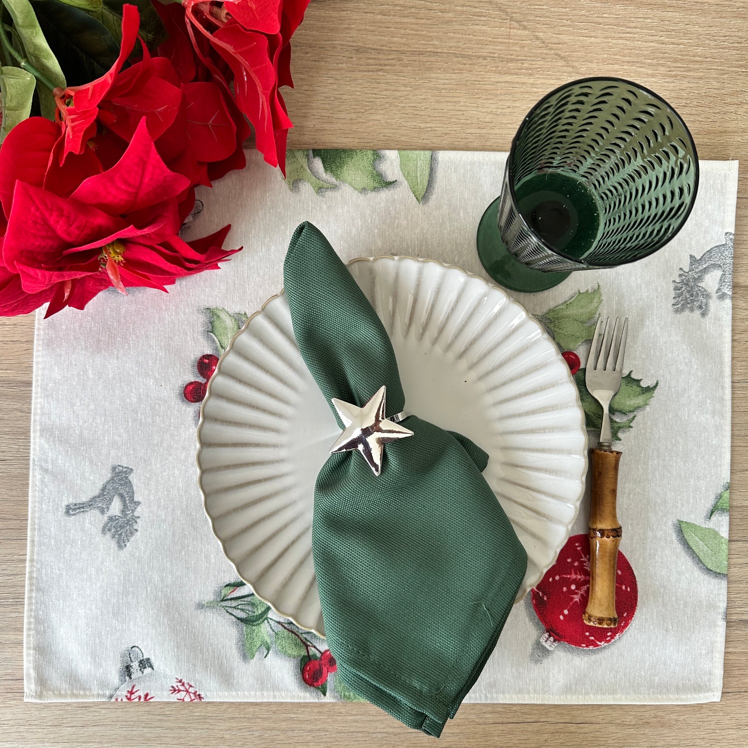 Set de 4 individuales de fondo crema y entañables dibujos navideños. Rematados con basta estrecha de medio centímetro.