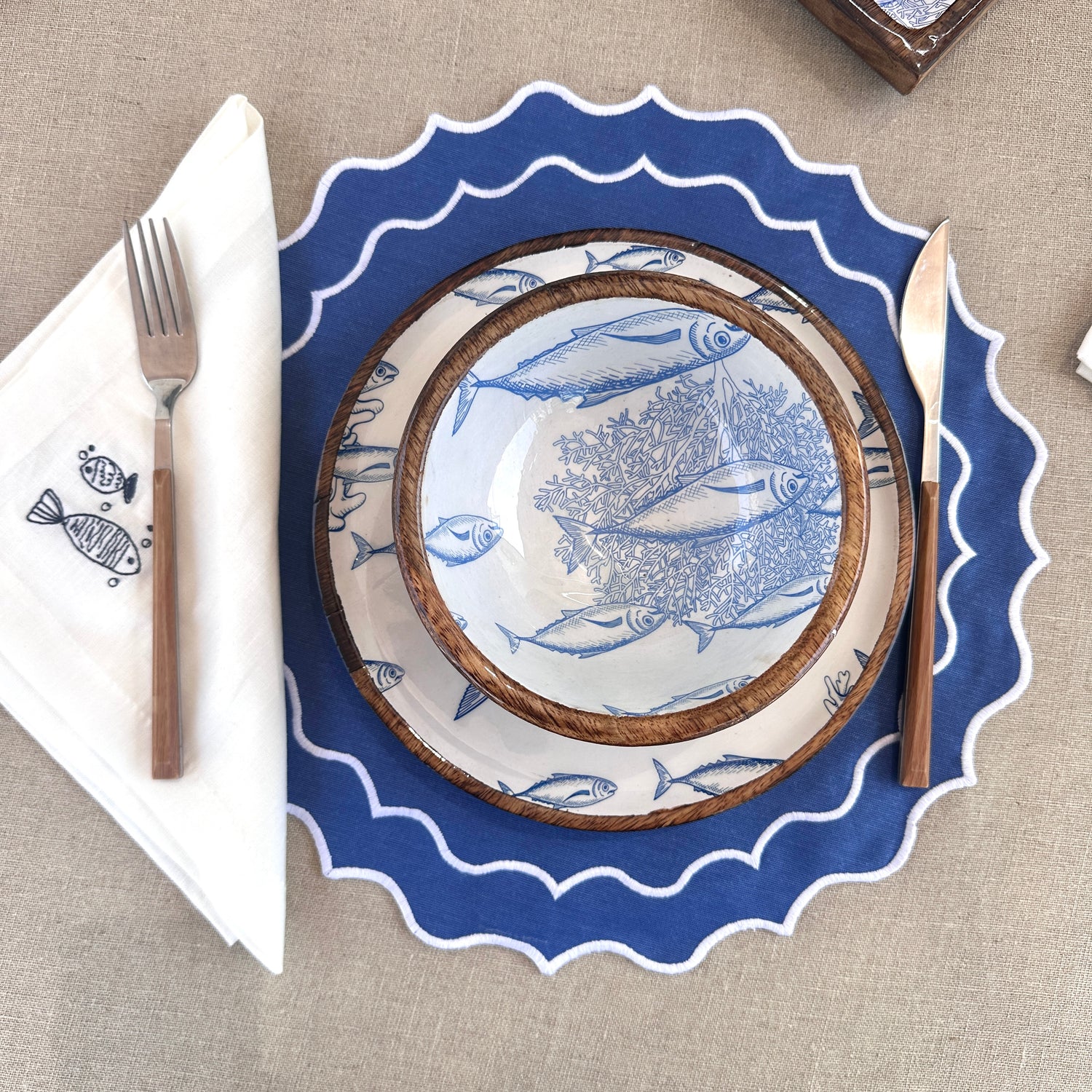 Cuenco para piqueos en madera de mango lacada, con estampado de peces.