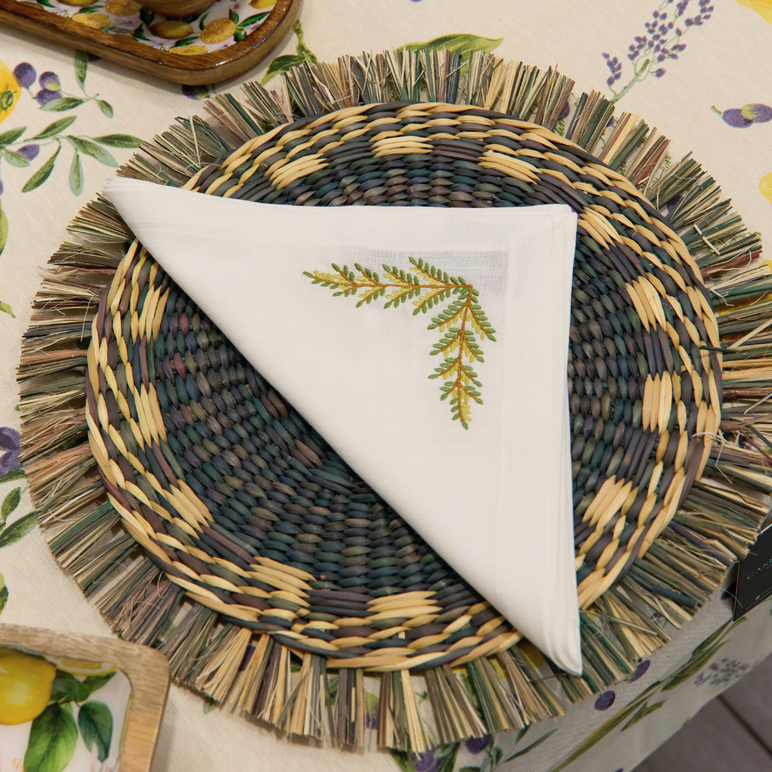 Servilleta de tela color blanco, con un delicado bordado de hojas verdes y ramas ocre, en hilo de algodón. Acabado en basta sencilla.