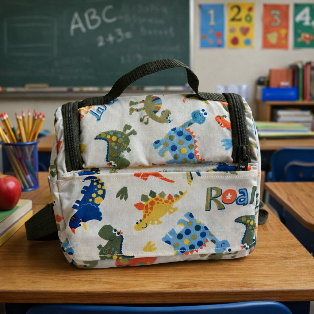 Lonchera con nuestra tela antimanchas en un simpático estampado de dinosaurios en distintos tonos, ideal para llevar el snack o almuerzo.