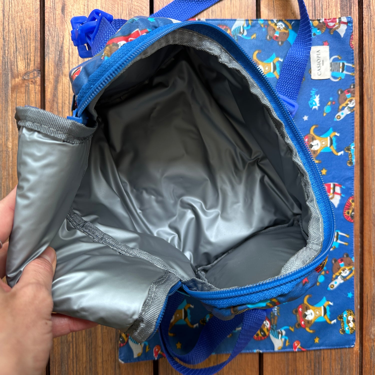 Lonchera con nuestra tela antimanchas en un simpático estampado de superhéroes en azules, ideal para llevar el snack o almuerzo.
