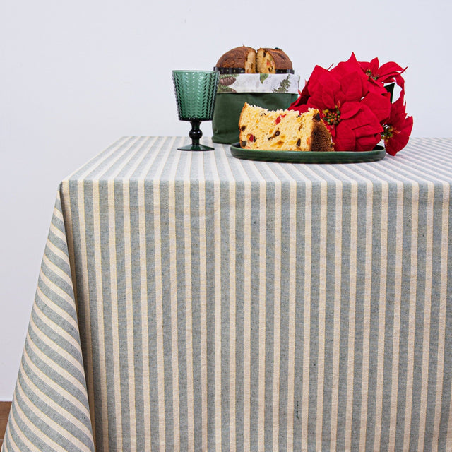 Elegante y original diseño en rayas verdes y beige con hilos dorados, para celebrar y disfrutar los momentos más especiales alrededor de una mesa.