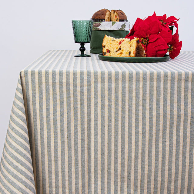 Elegante y original diseño en rayas verdes y beige con hilos dorados, para celebrar y disfrutar los momentos más especiales alrededor de tu mesa.