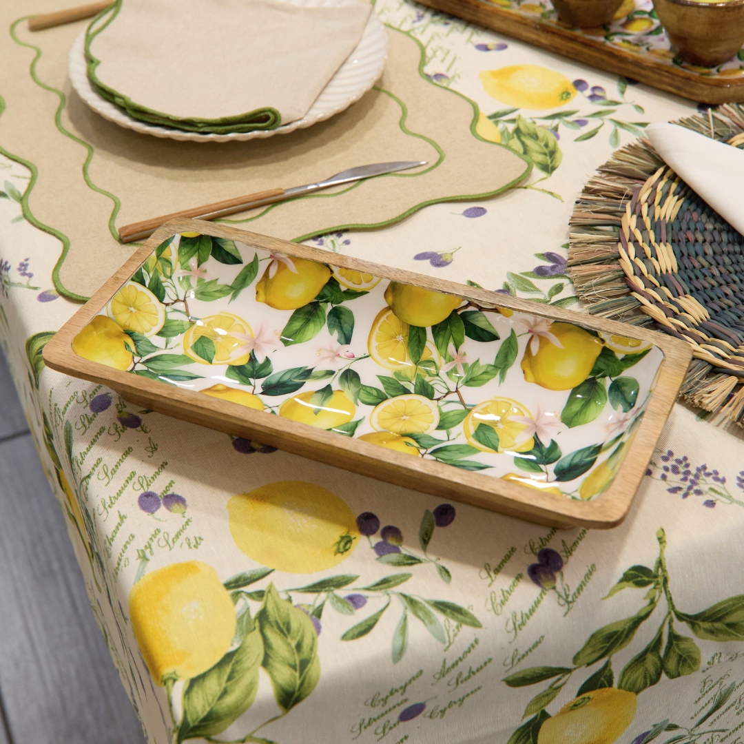 Bandeja rectangular en madera de mango lacada, con estampado de alegres limones ideal para decorar la mesa.