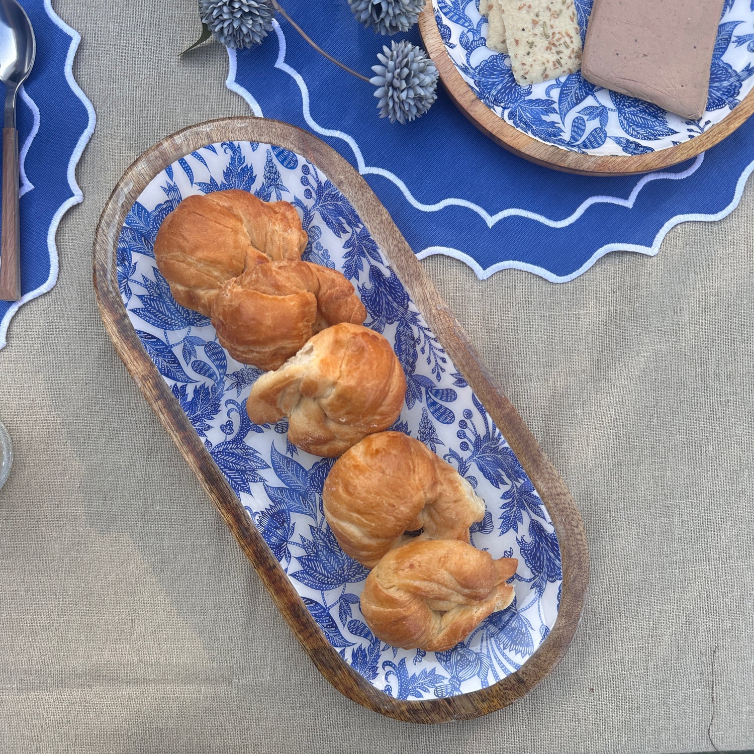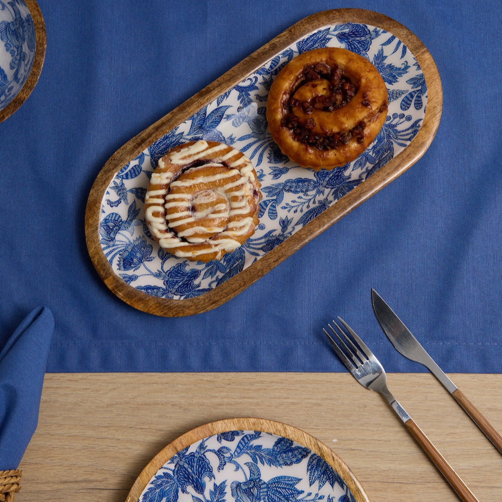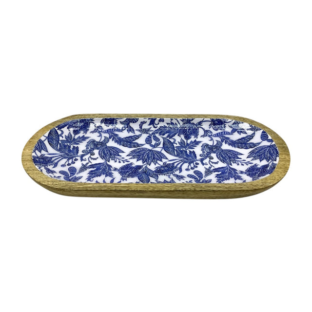 Bandeja ovalada para piqueos en madera de mango lacada, con estampado de flores azules.