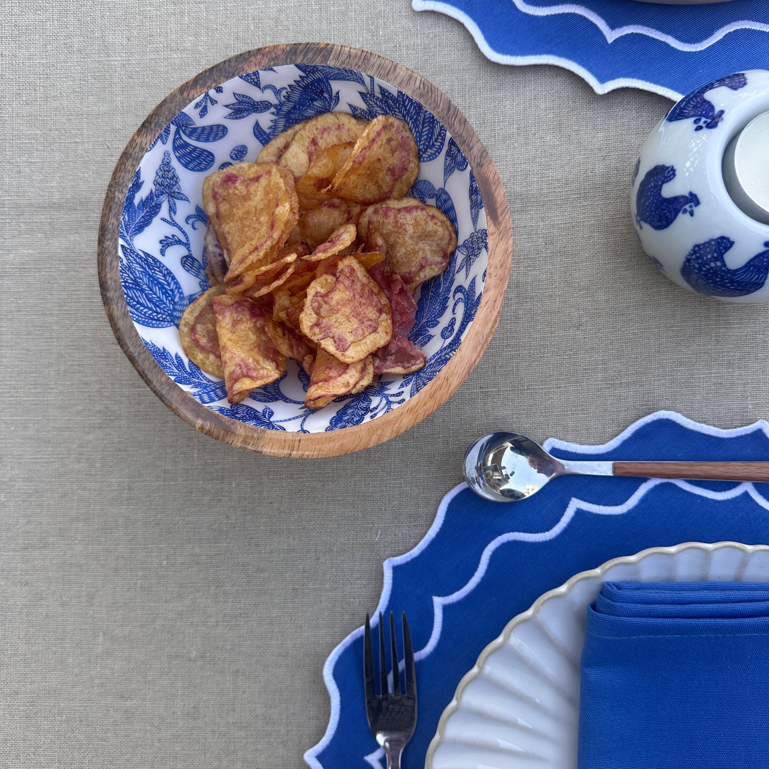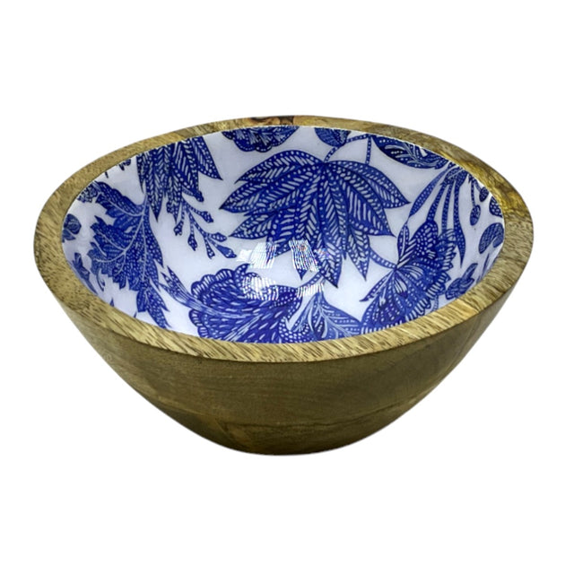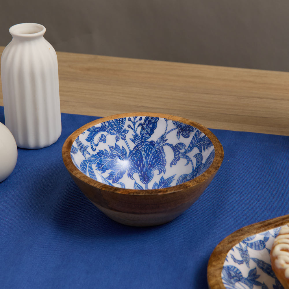 Bandeja ovalada para piqueos en madera de mango lacada, con estampado de flores azules.