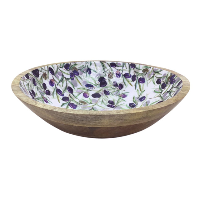 Ensaladera en madera de mango lacada, con estampado de aceitunas.