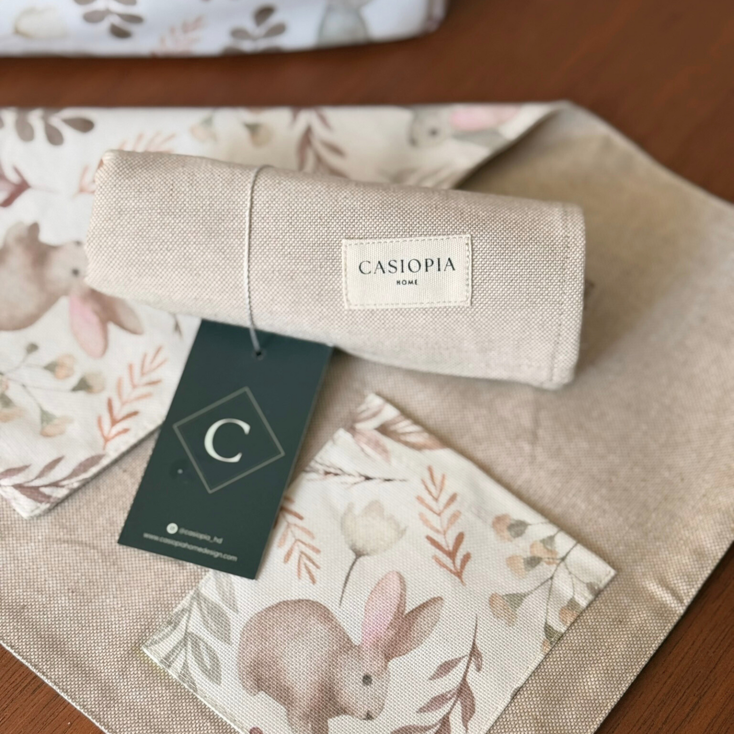 Pack de individual con nuestra tela antimanchas en un divertido estampado de conejitos sobre fondo hueso, ideal para llevar el snack o almuerzo, más 4 servilletas a juego de algodón en color beige.