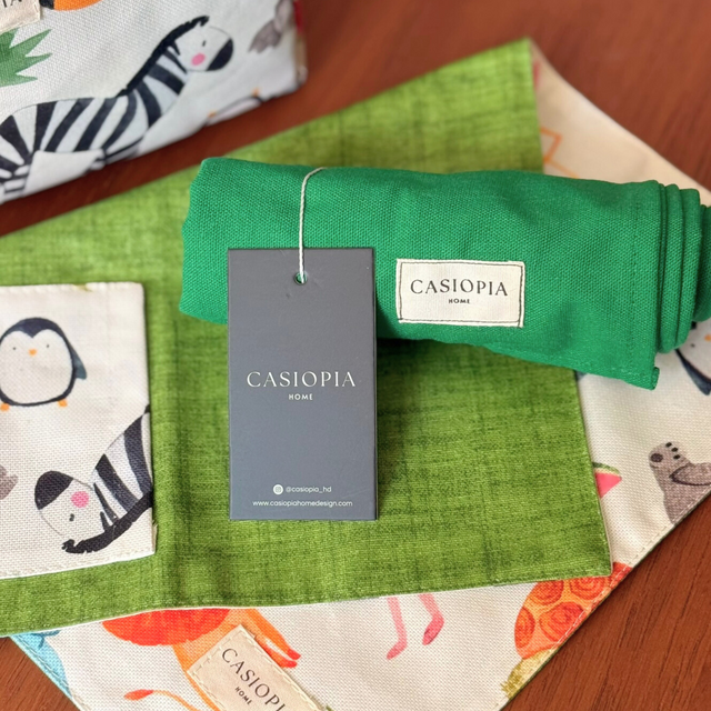 Pack de individual con nuestra tela antimanchas en un divertido estampado de animalitos de la selva sobre fondo hueso, ideal para llevar el snack o almuerzo, más 4 servilletas a juego de algodón en color verde musgo.