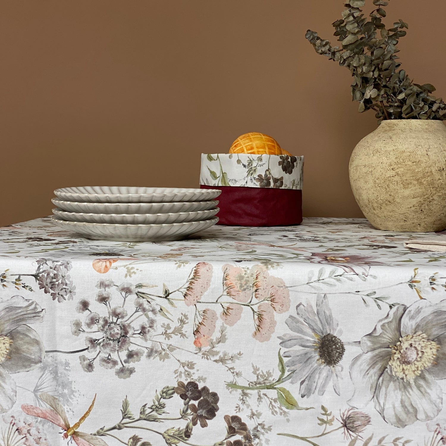 Precioso mantel de motivos florales en tonos empolvados, y diseño de mariposas. Combina tanto en exteriores como en interiores debido a su estampado en colores tenues.
