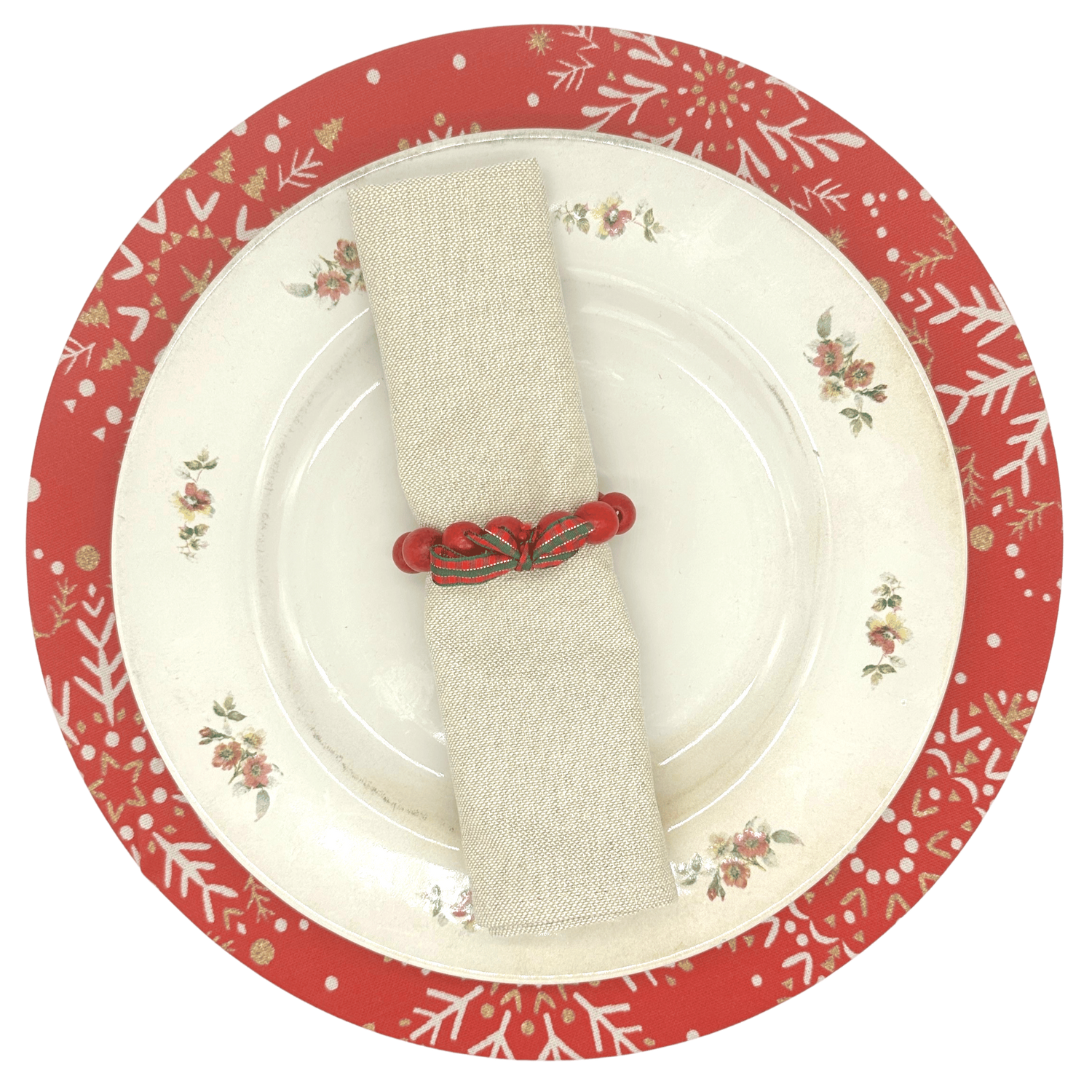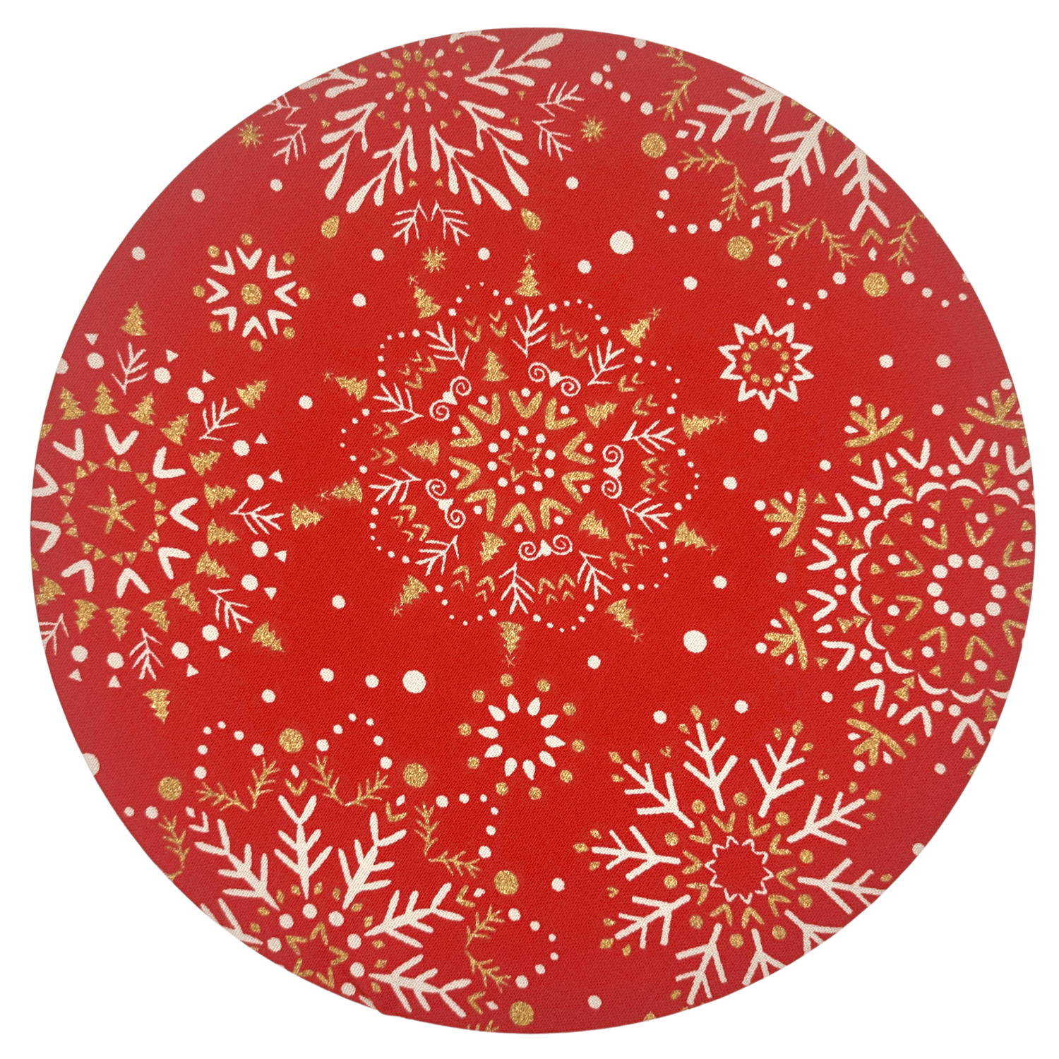 Bajoplato de tela antimanchas confeccionado en tela de estampado navideño 90 % algodón y 10% poliéster, y una base de madera de trupan lo que la hace resistente y duradera.