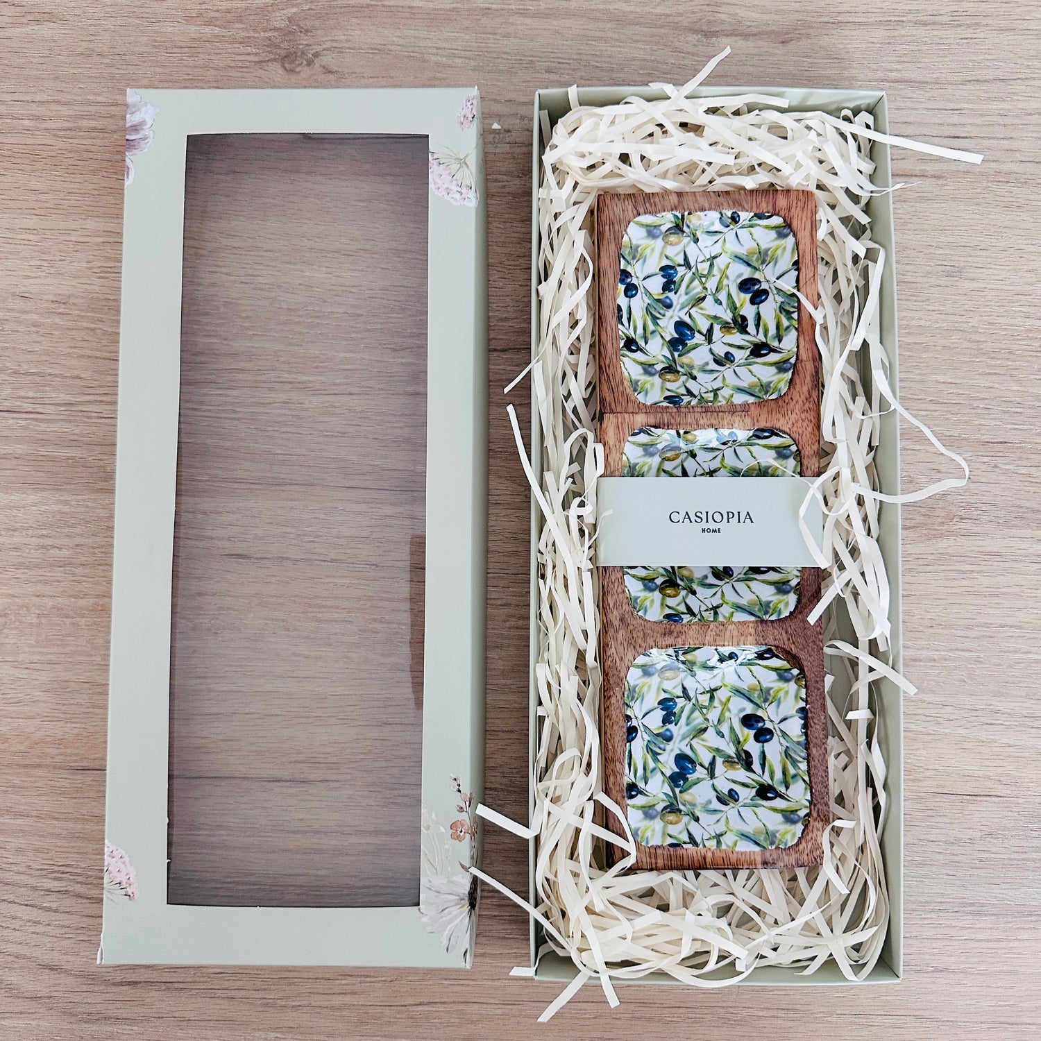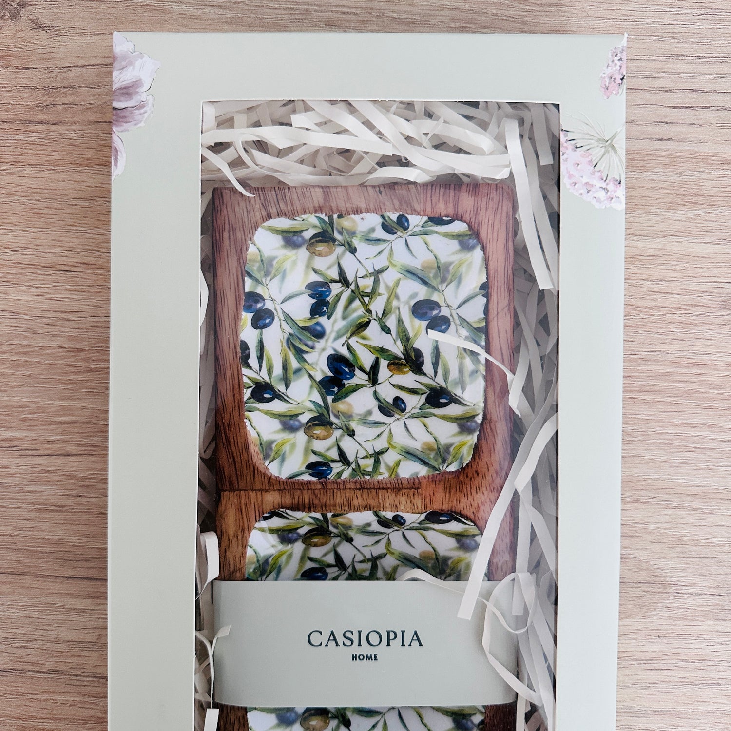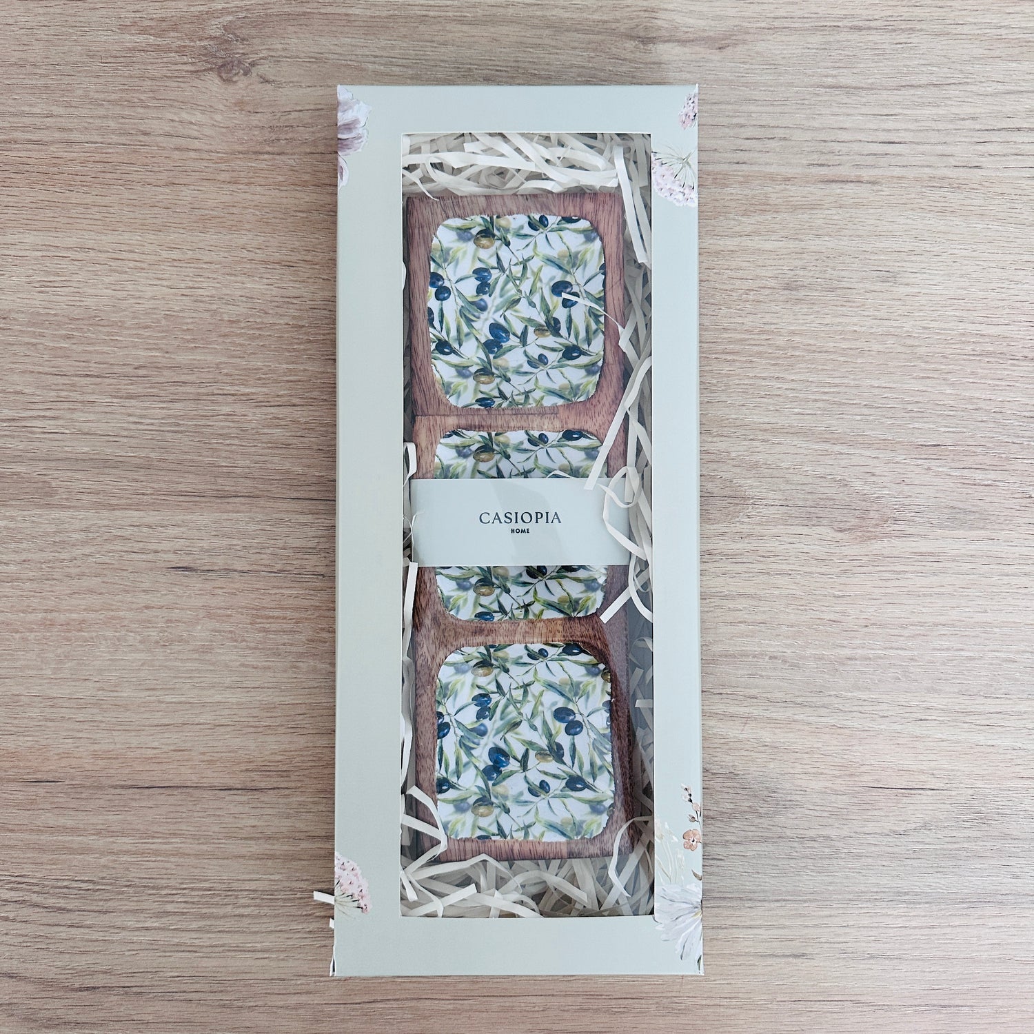 Bandeja rectangular en madera de mango lacada, con estampado de alegres olivas y tres divisiones, ideal para decorar la mesa y servir deliciosos piqueos.