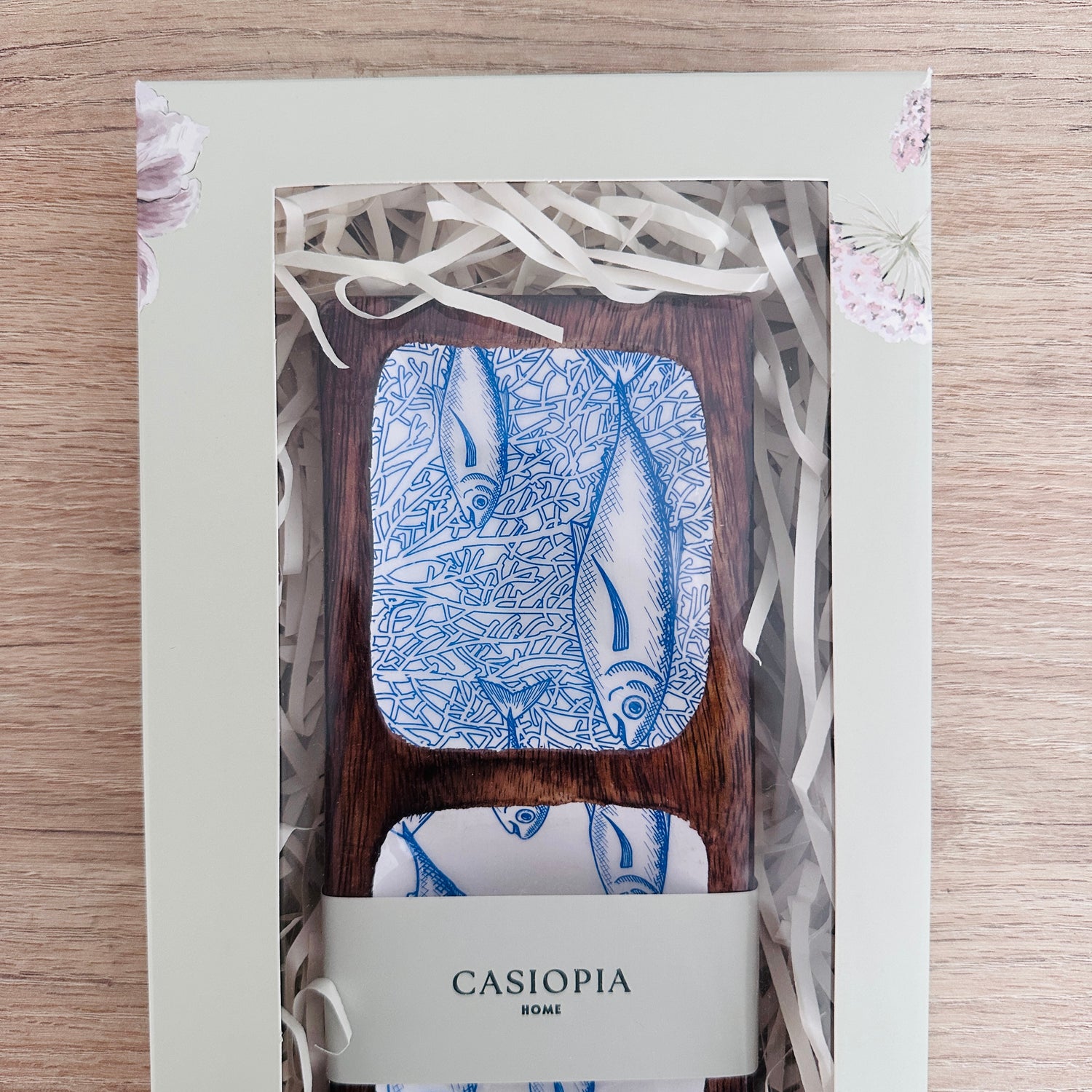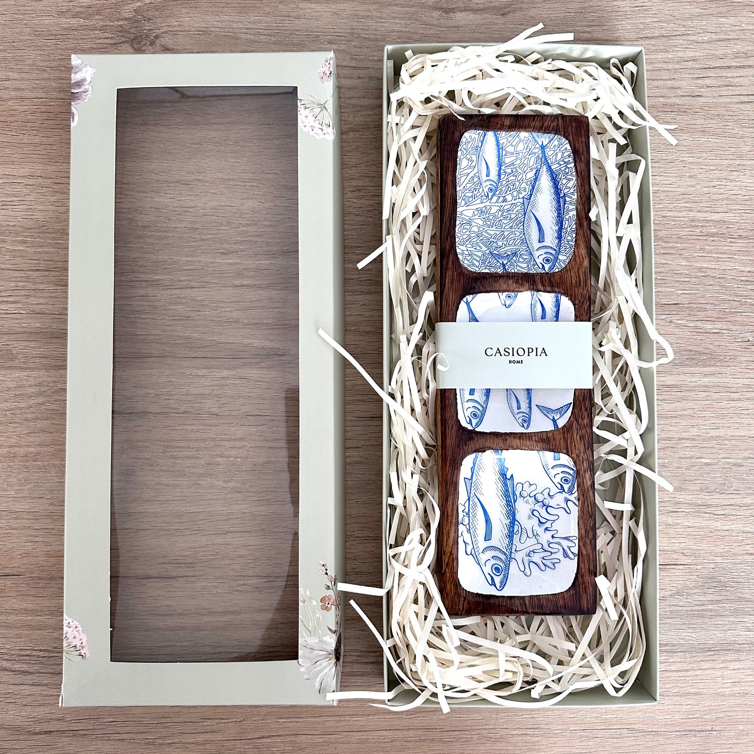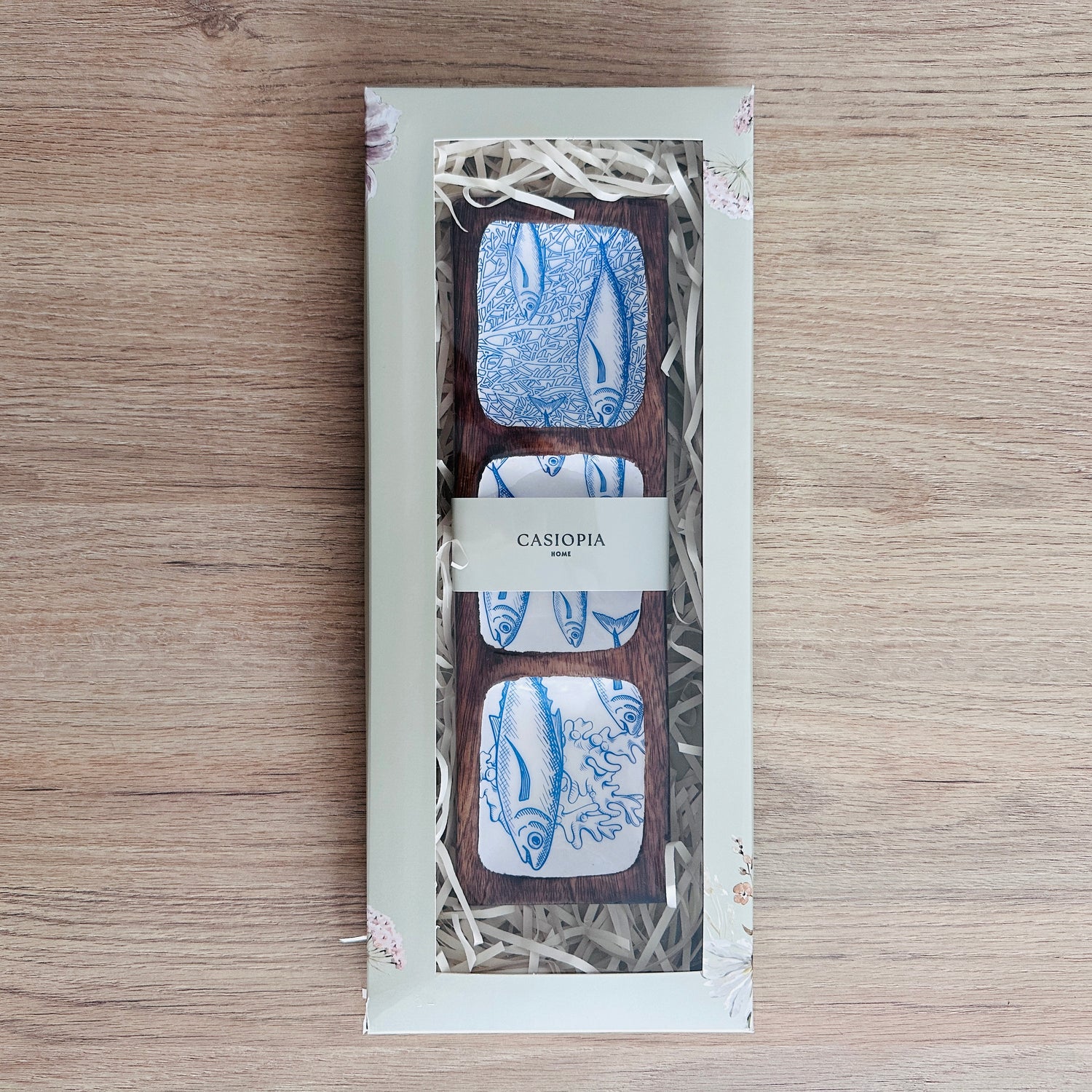 Bandeja rectangular en madera de mango lacada, con estampado de peces en tonos azules y tres divisiones, ideal para decorar la mesa y servir deliciosos piqueos.