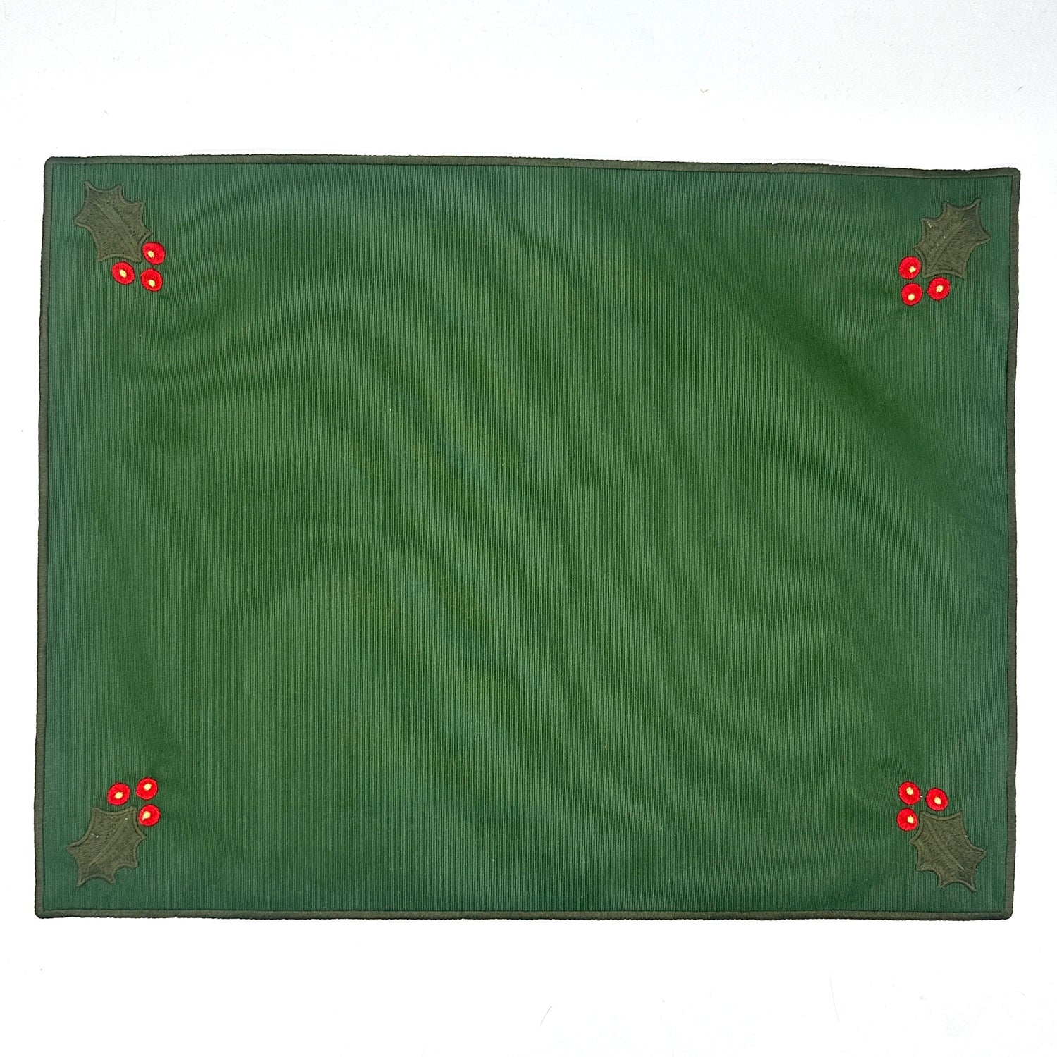 Delicado individual de forma rectangular en tela antimanchas color verde olivo, con un marco bordado en verde oscuro, y navideño diseño en las esquinas de acebos en rojo.
