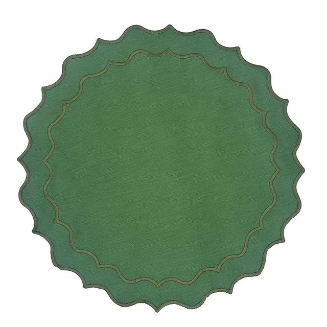 Delicado individual de forma redonda en tela antimanchas color verde olivo, con un fino bordado doble en hilo de algodón mate color verde más oscuro, formando un elegante diseño con ondas.