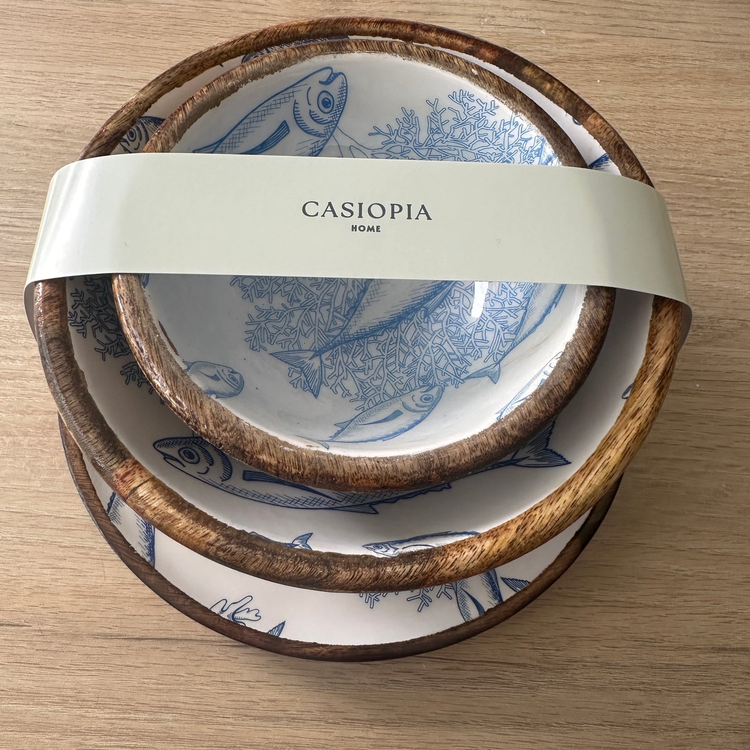 Este pack ideal para regalo incluye dos platos con estampado de flores azules en dos tamaños diferentes, más un cuenco a juego, ideal para piqueos.