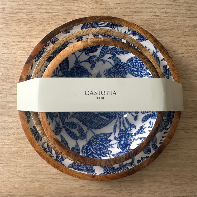 Este pack ideal para regalo incluye dos platos con estampado de flores azules en dos tamaños diferentes, más un cuenco a juego, ideal para piqueos.