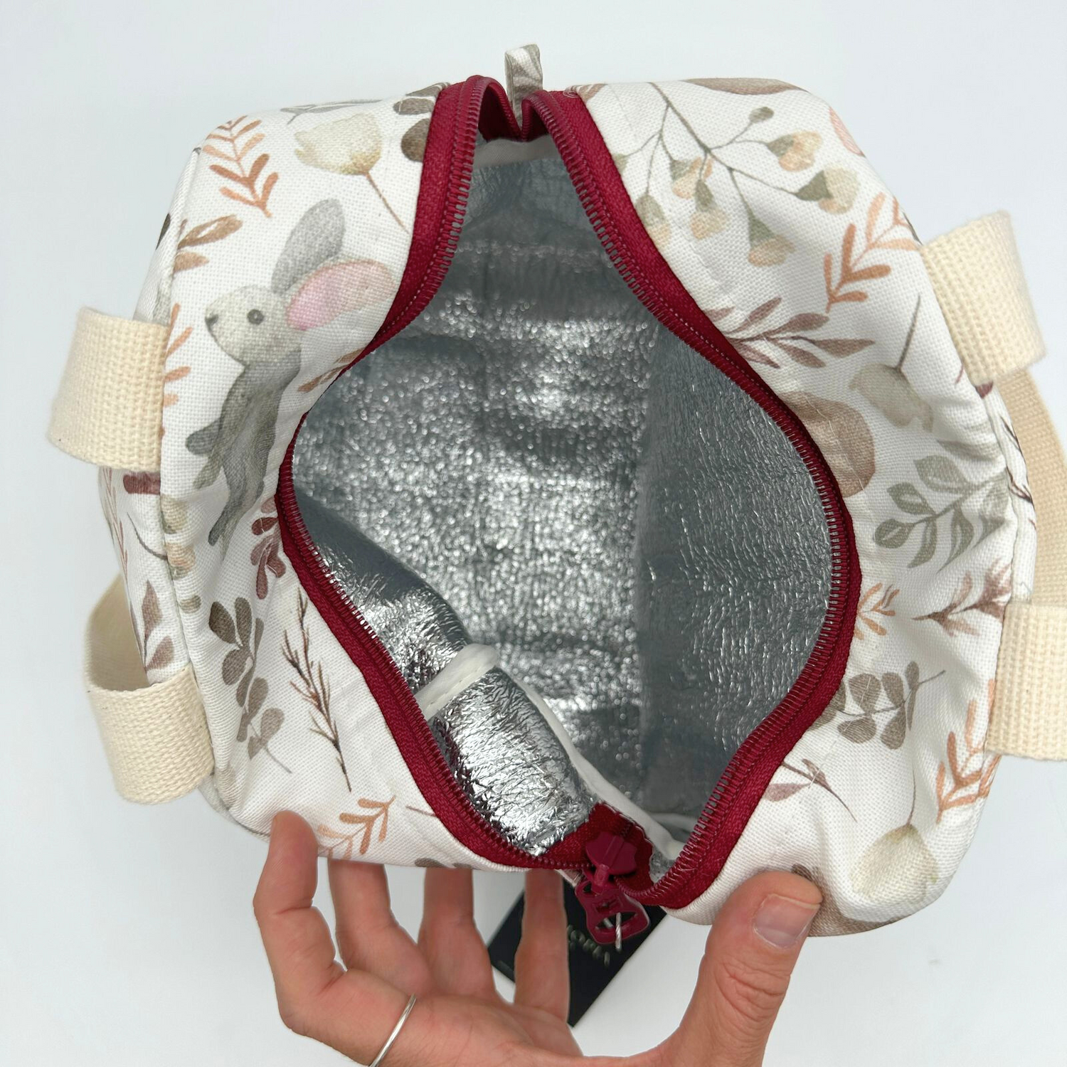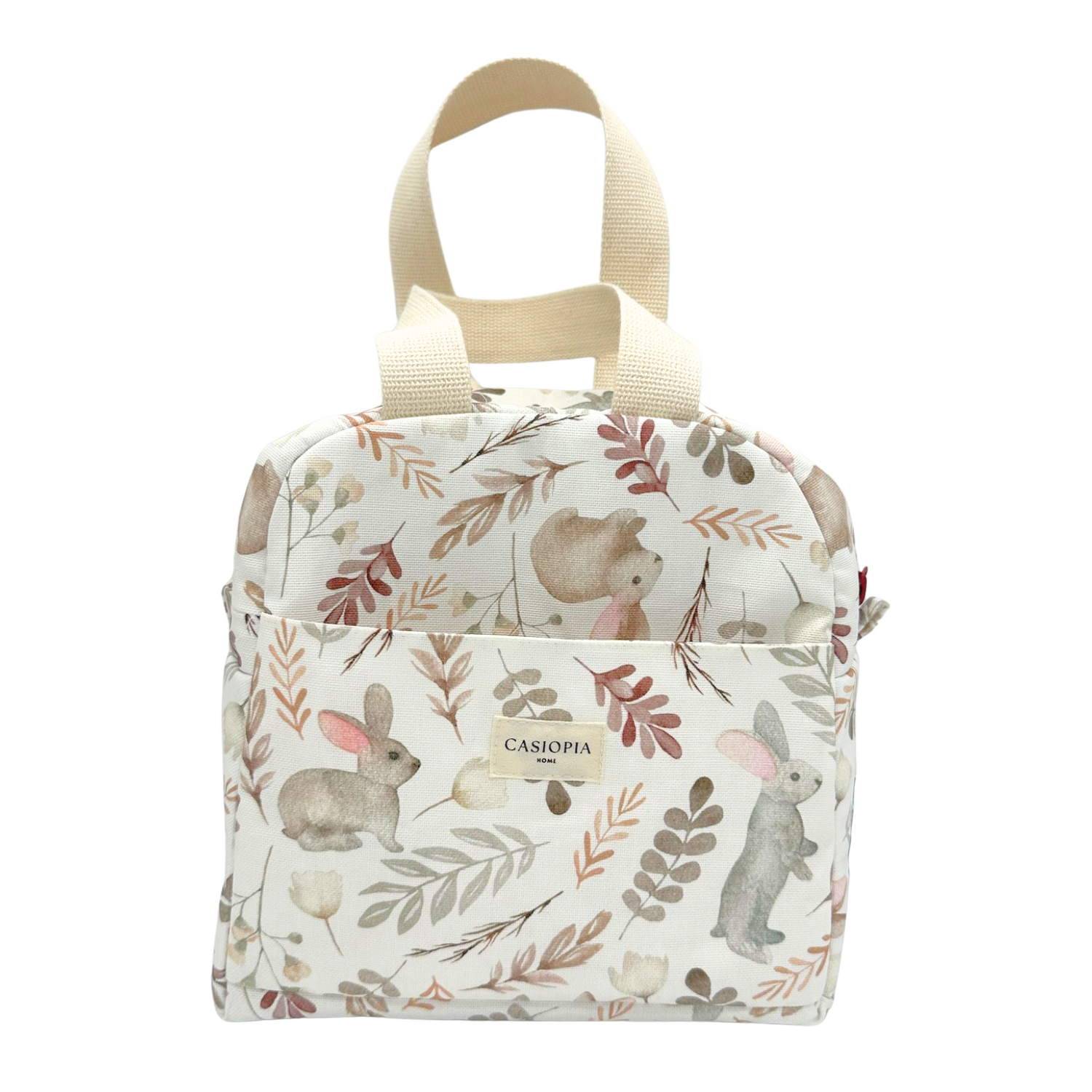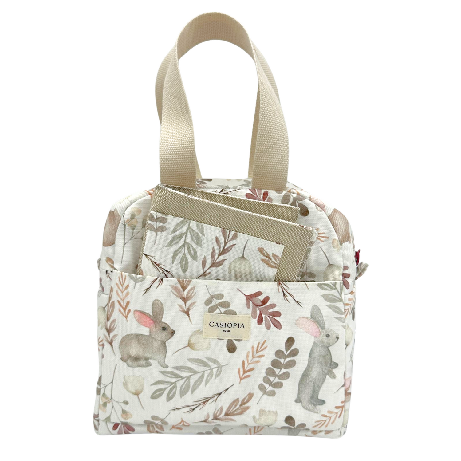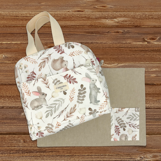 Pack de lonchera e individual con nuestra tela antimanchas en un lindo estampado de conejitos y plantas fondo hueso, ideal para llevar el snack o almuerzo a todas partes.