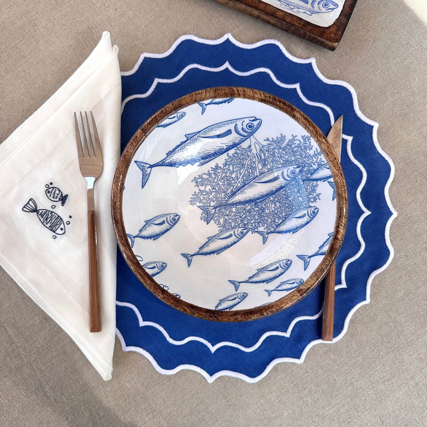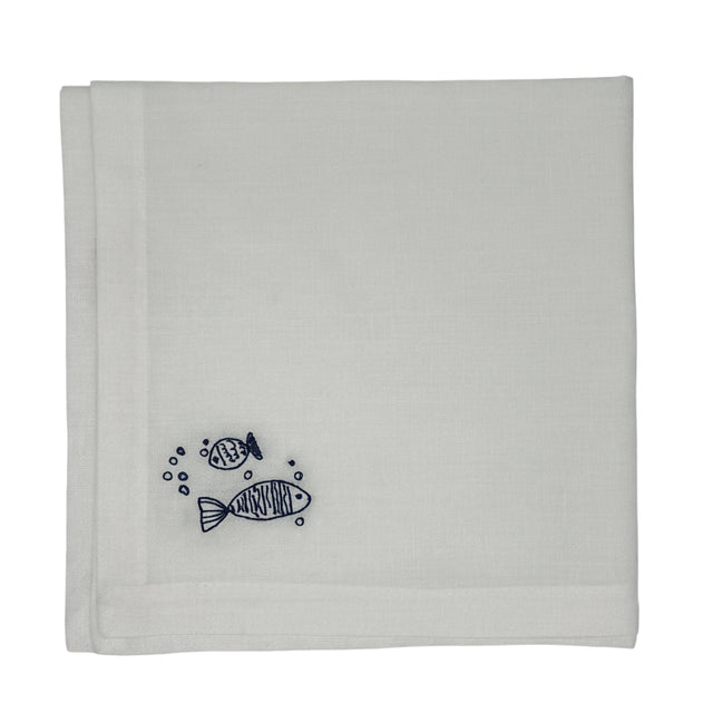 Servilleta de tela color blanco, con un delicado bordado marino de peces azules, en hilo de algodón. Elegante acabado en inglete con basta de 2 cm.