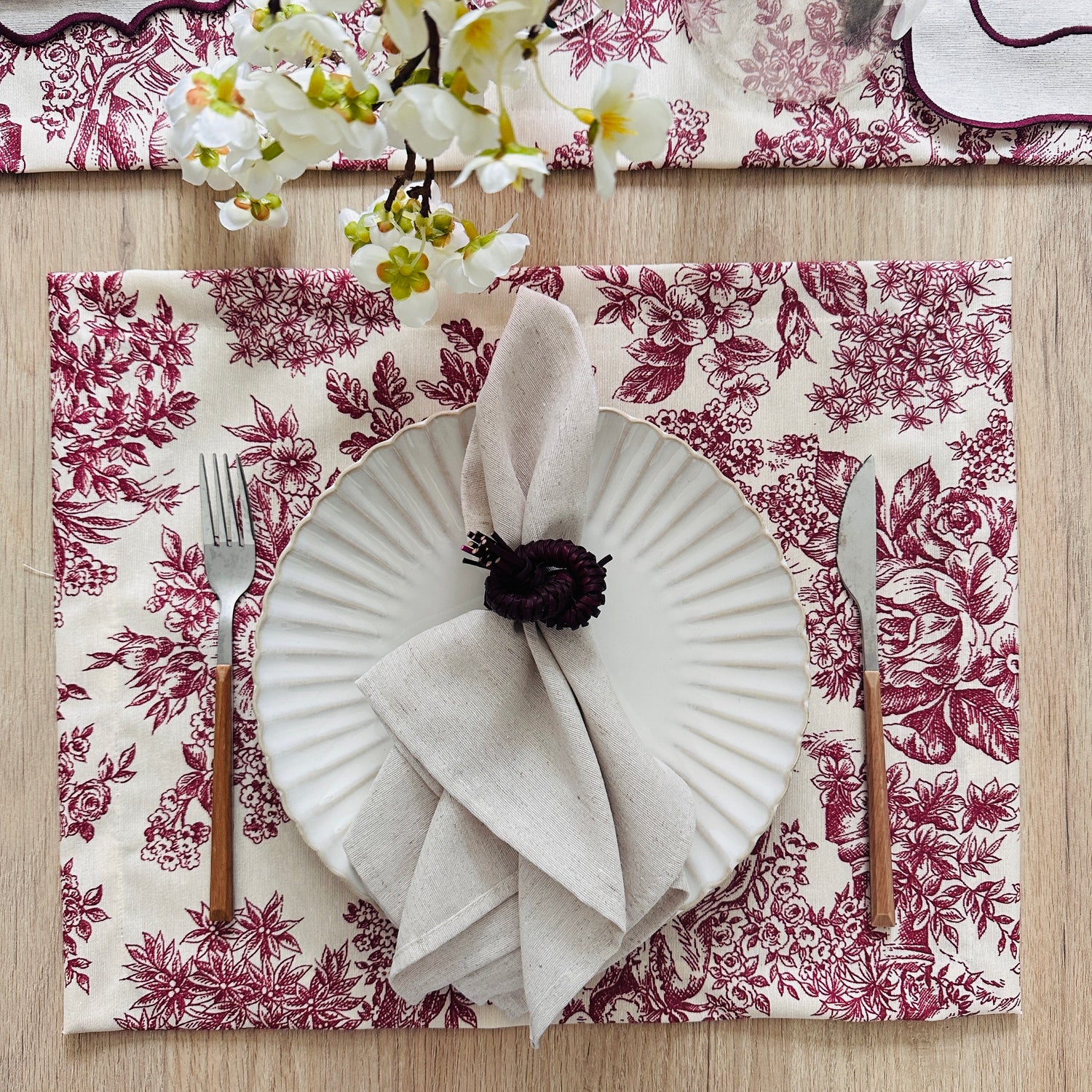 Set 4 Individuales antimanchas Toile de Jouy granate + Camino Hueso