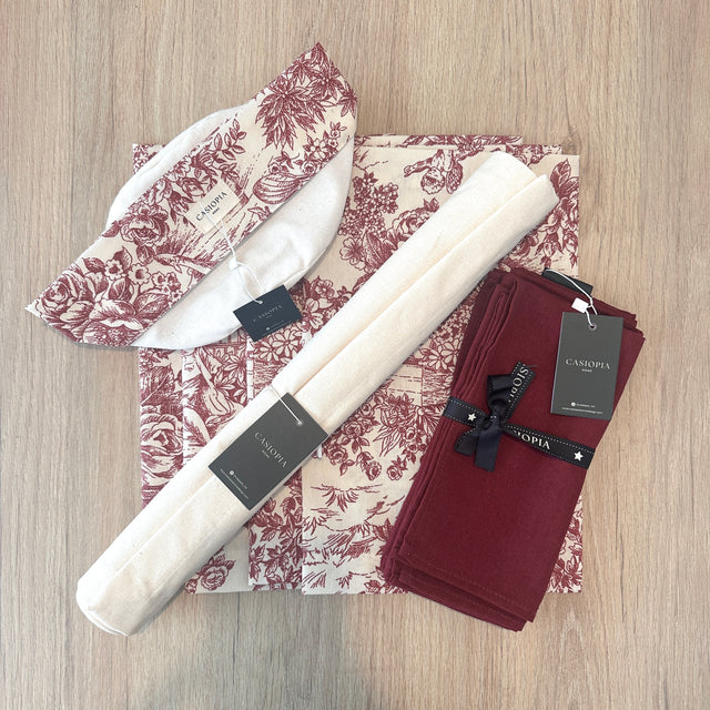 Set 4 Individuales Toile de Jouy granate + Camino de mesa Hueso + 4 servilletas granate + Panera está agotado y se enviará tan pronto como vuelva a estar disponible.