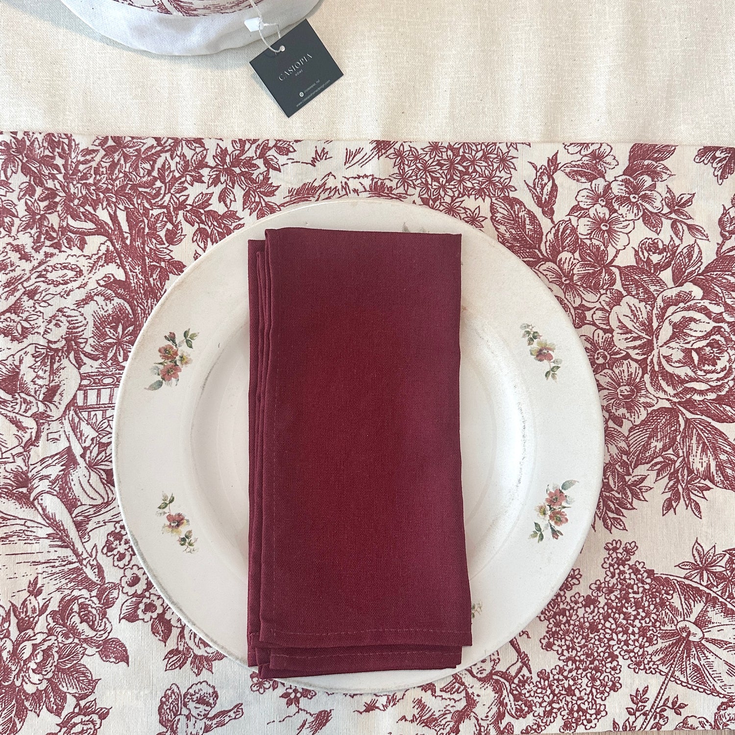 Set 4 Individuales Toile de Jouy granate + Camino de mesa Hueso + 4 servilletas granate + Panera
