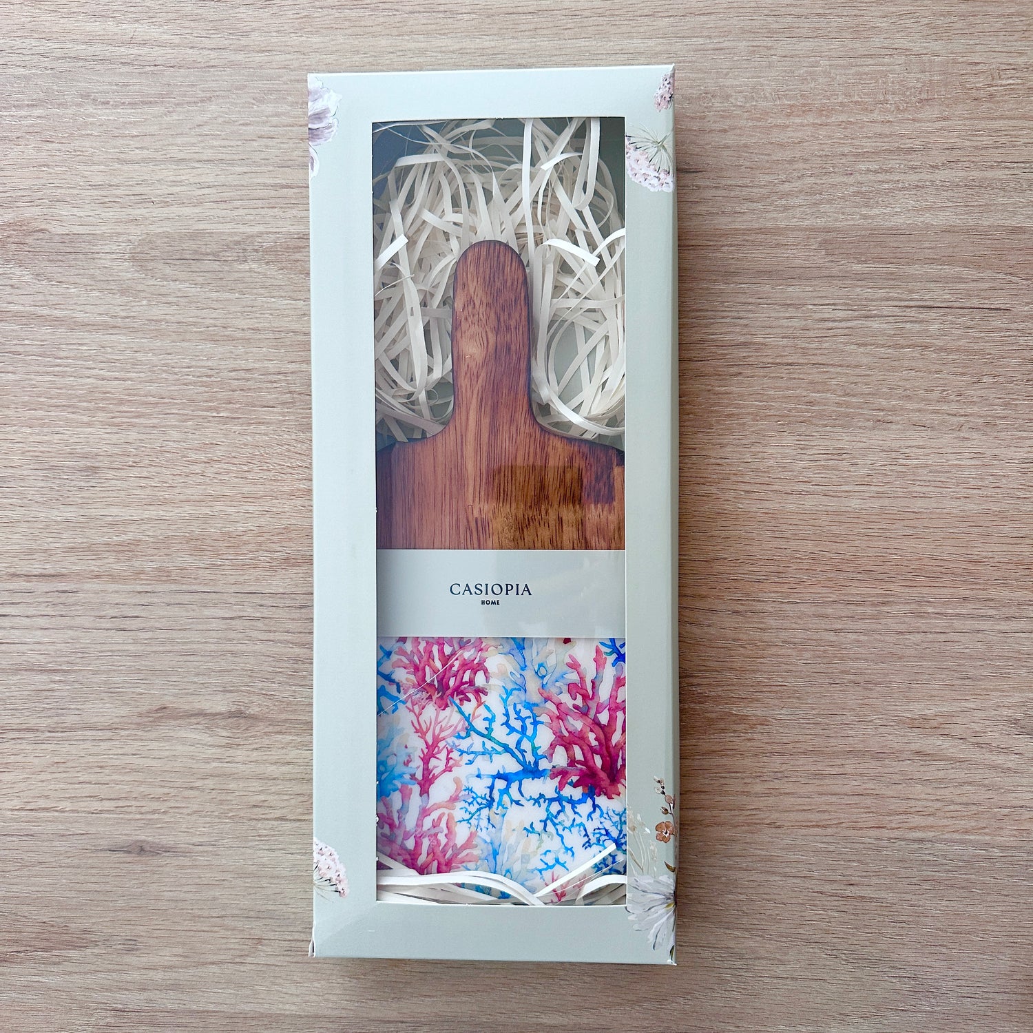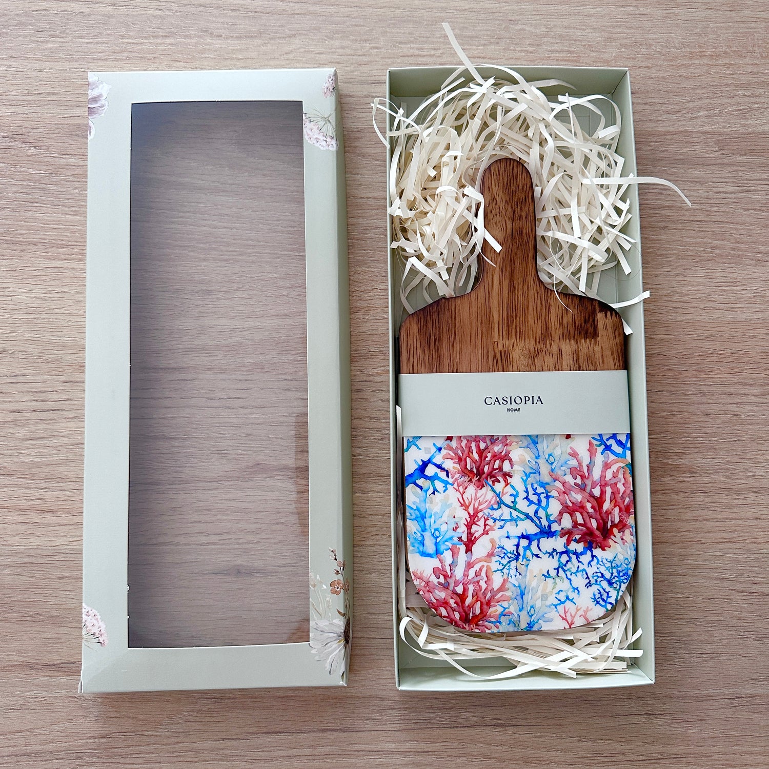 Tabla en madera de mango lacada, con mitad estampada en corales.