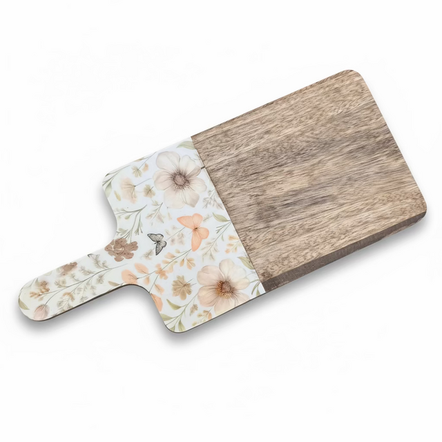 Tabla en madera de mango lacada, con mitad estampada en flores y mariposas en tonos empolvados.